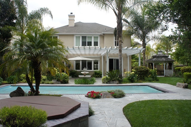Details: Lovely two-story home on a quiet cul-de-sac. Formal entry with high ceilings and stone tile floors, a formal living room with carpet and designer window coverings. Formal dining room with stone tile floors, designer window coverings, and lighting. Large kitchen with stone tile floors, built-in refrigerator, double ovens, gourmet 6-burner gas stove top & stainless hood, built-in microwave. Granite counters and a granite-topped island. The kitchen opens to the family room, which features a fireplace and a built-in entertainment center. First-floor bedroom with a walk-in closet. Full bathroom on first floor. Beautiful ensuite, primary bedroom, and bath. The primary bathroom includes dual vanities, a large tub, a separate stall shower, and a huge walk-in closet. Plantation shutters in both master and master bath. Inside laundry room with cabinets and sink. Lovely back yard is an oasis; amenities include in-ground pool w/cover, spa w/cover, gazebo, lush foliage, large patio with pergola and more! Finished 2 car garage, on-demand water heater, water softener, A/C
